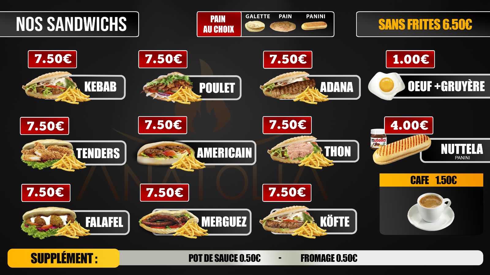 Nouvelle carte, tacos, falafel, burger..... Bref du choix pas seulement kebab, un très bon accueil. Établissement à recommander.