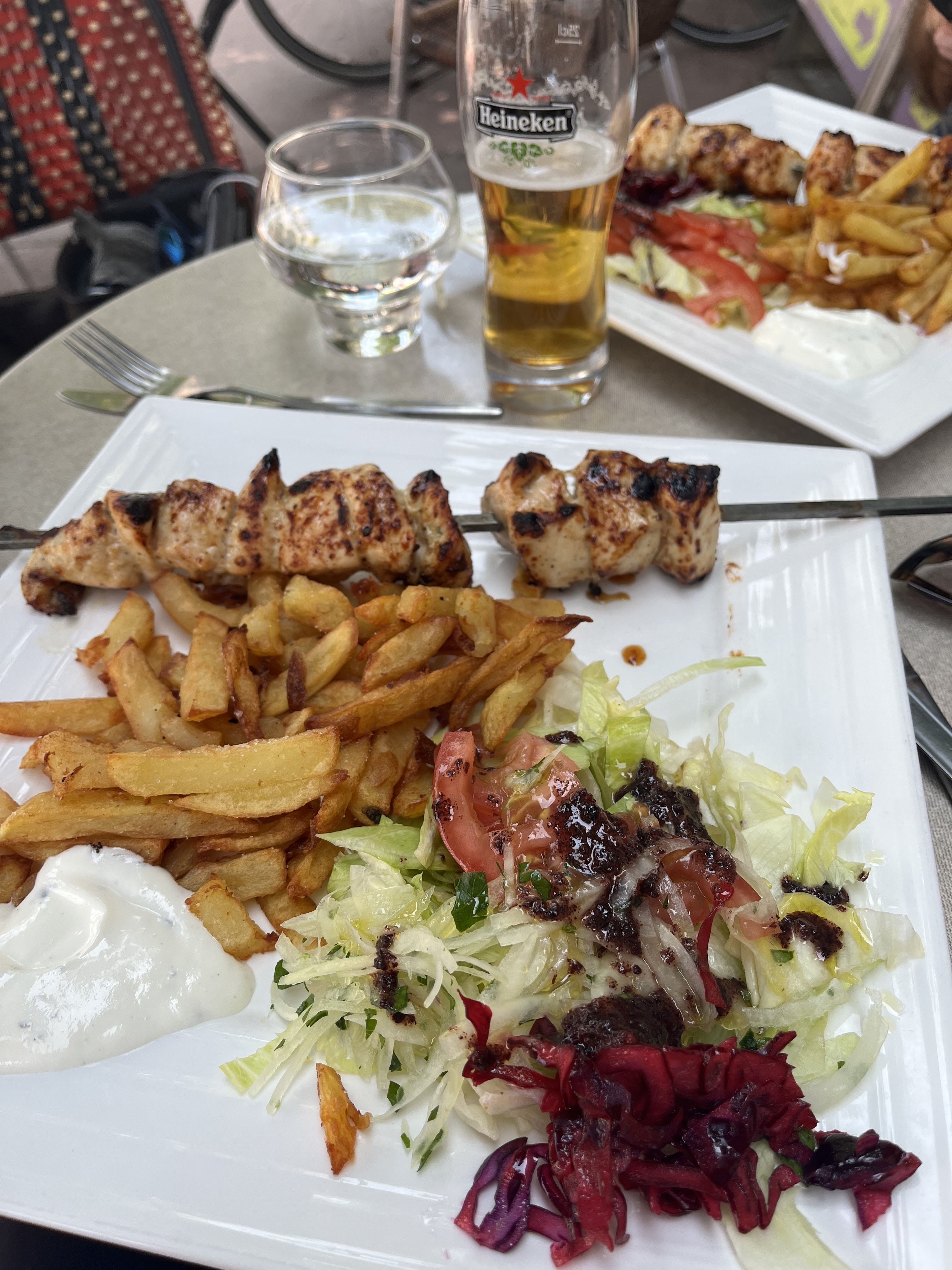 Bonne bouffe ! Fraîchement cuit. Il y avait une brochette de poulet fracassante (gros et nombreux morceaux de viande sur la brochette), avec garniture de salade et frites. Beaucoup apprécié. Recommande fortement.