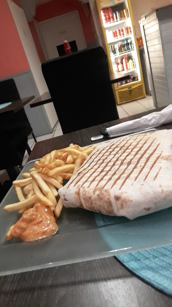Très sympathique mais le wrap n'était pas chauffé donc c'était un peu détrempé les frites étaient super chaudes et savoureuses et sucrées nous avons eu la mayonnaise gratuitement