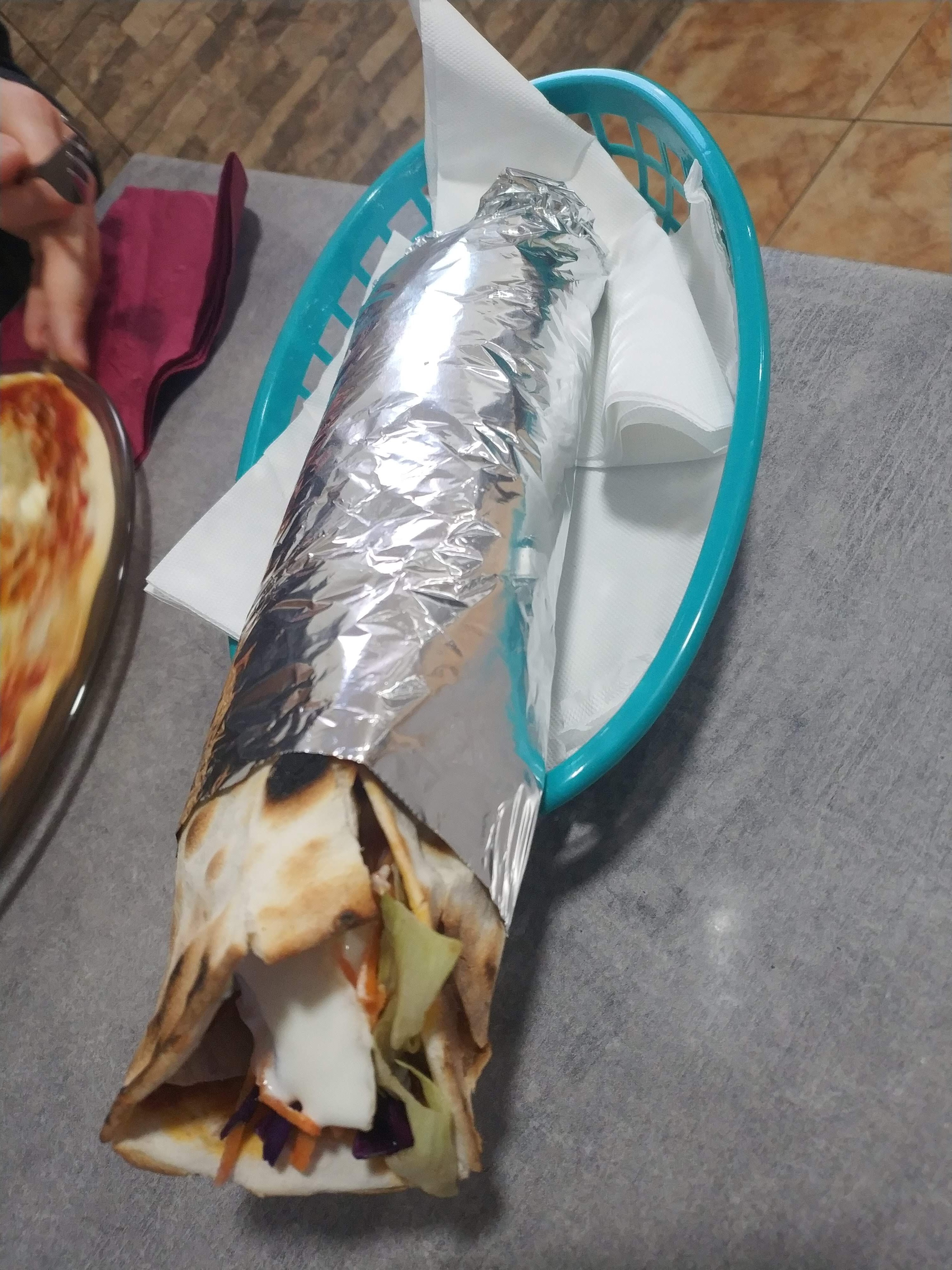 Jamais vu un kebab qui chargé autant en viande. Bon il faut dire qu'on avait pris ceux avec la viande seule. C'est une performance d'en finir un.