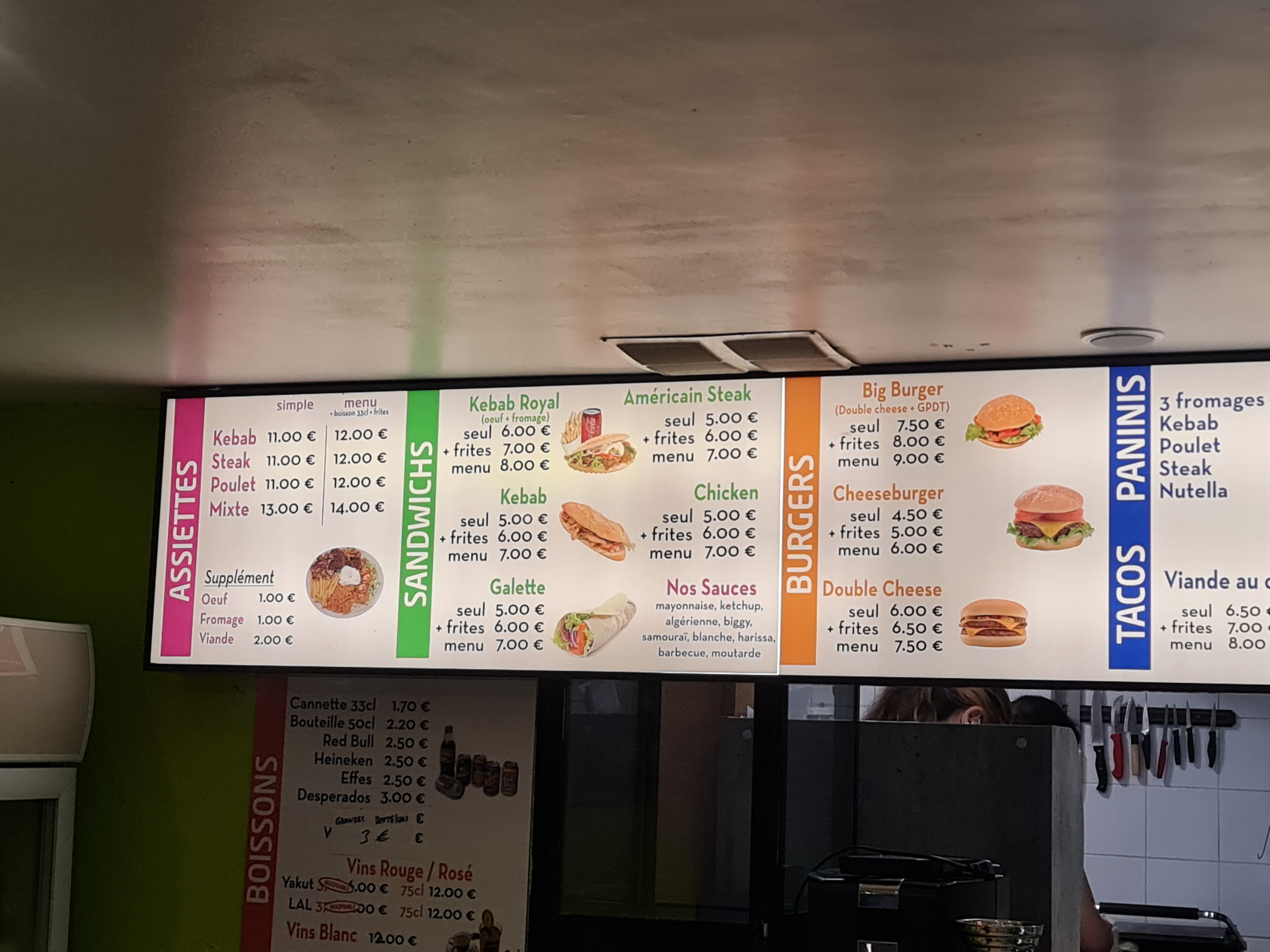 En arrivant j'ai été pris d'un accueil digne de ce nom avec des employés toujours très souriant qui change de la majorité des restaurants rapides. J'ai effectué une commande d'assiette kebab et que dire c'était succulent, une viande de qualité avec du goût. De même pour les frites, très bonne cuisson et en bonne quantité accompagnée de crudités juste rafraîchissant. De plus ils proposent un large choix de boissons.