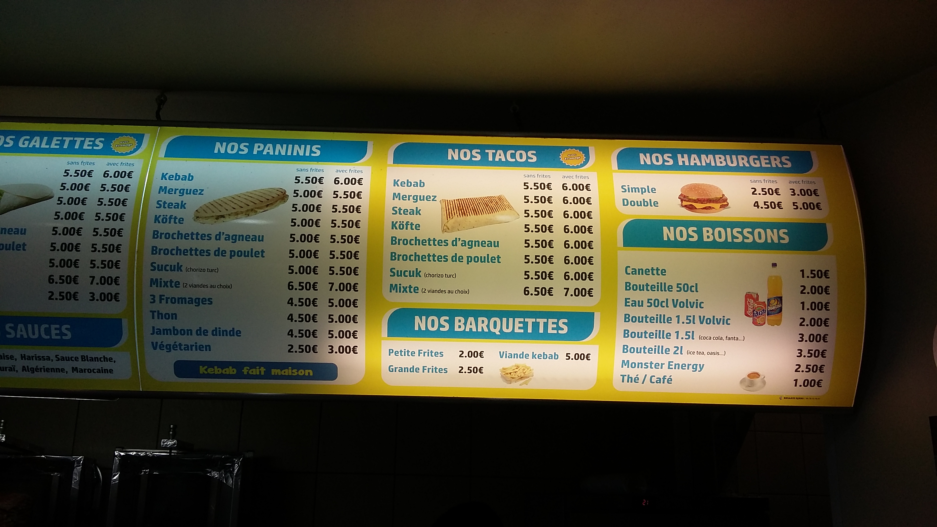Le kebab n’etait pas bon, pas de sauce dans mon tacos frite fade sans sel Ils n’ont pas de sauce curry sauce andalouse ni barbecue bravo le veau ! A l’intérieur sa pue le cramer ! L’eau a un goût de tartre Décevant . C’est un zéro pointé mérité. Allez au boulot ! Si j’aurais pu j’aurais mis 0 étoiles ! Non mais oh non mais allo tu m’as pris pour qui tu m’as pris pour Roméo non mais’ allo non mais allo l’eau au. Tartre à l’eau potable