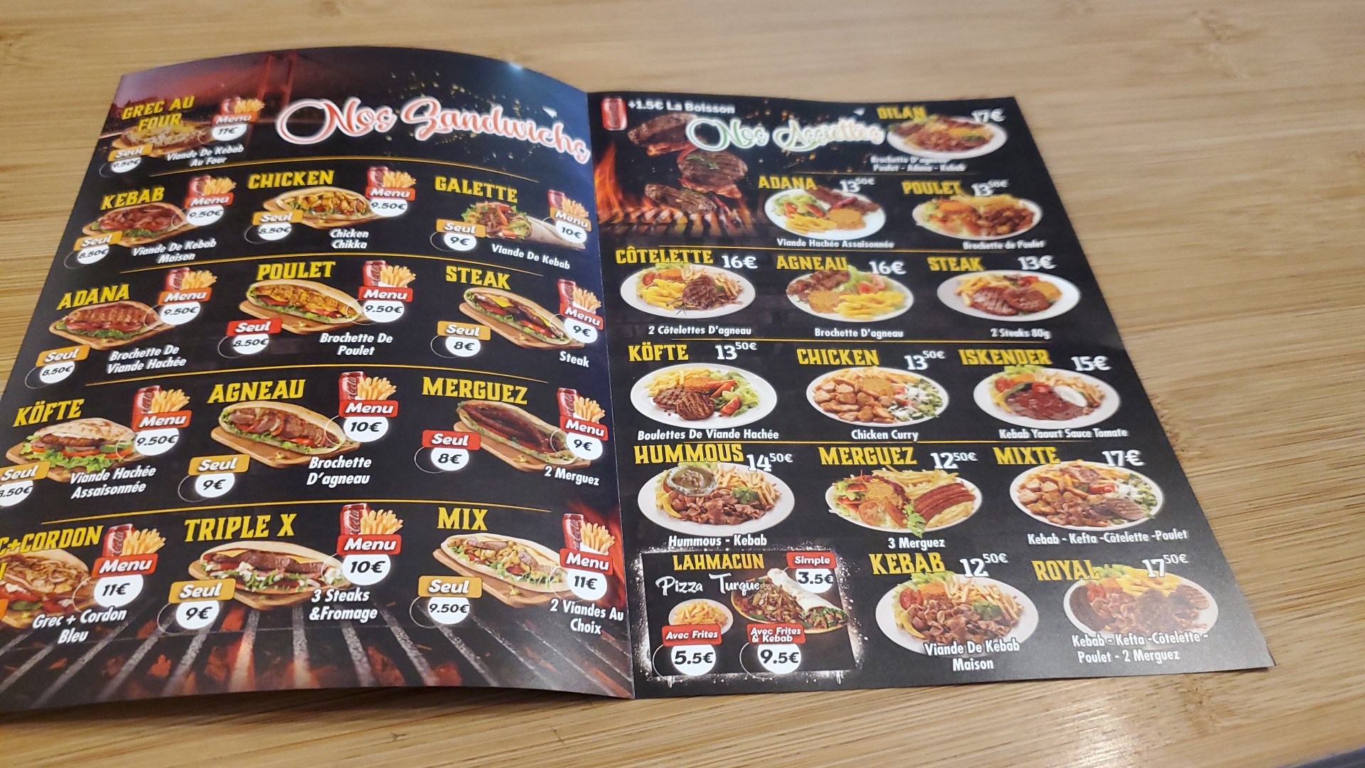 Honnêtement les prix sont exorbitants pour ce que c’est. Une assiette Dylan a 17€ sans boissons. L’assiette toute petite la photo n’est pas réaliste du tout. Malheureusement pour le prix le goût n’est pas spécial. Pour un grec turc je suis un peu trop déçu .