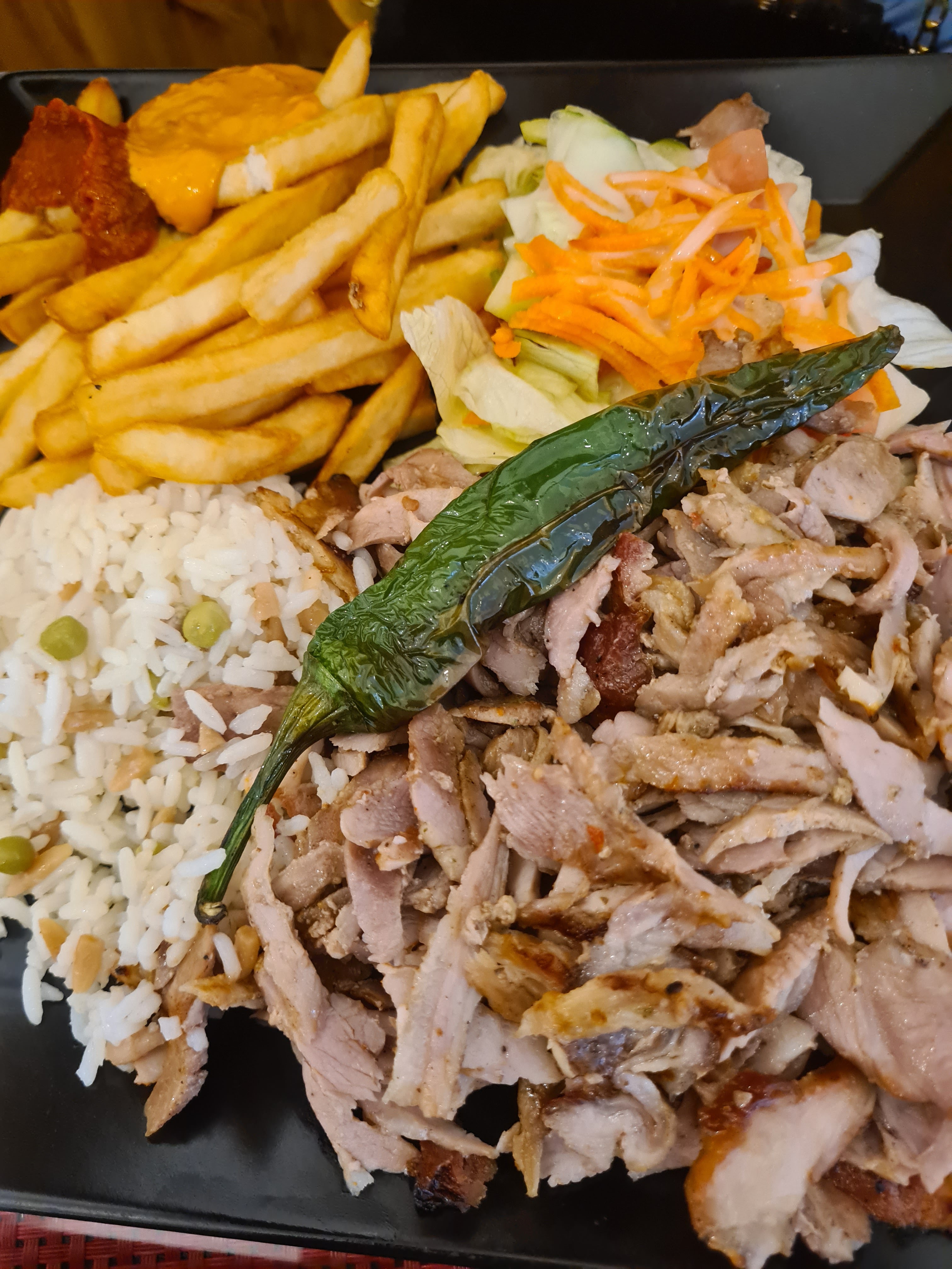 Je connaissais pas ce kebab j'ai testé Pas mal bien servi la viande est bonne J'ai pris à emporter Et je suis revenu manger à l'assiette c'était très bon La serveuse à le sourire Les préparateurs sont très sympa Juste un petit peu cher mais si c'est bon ça vaut le coup