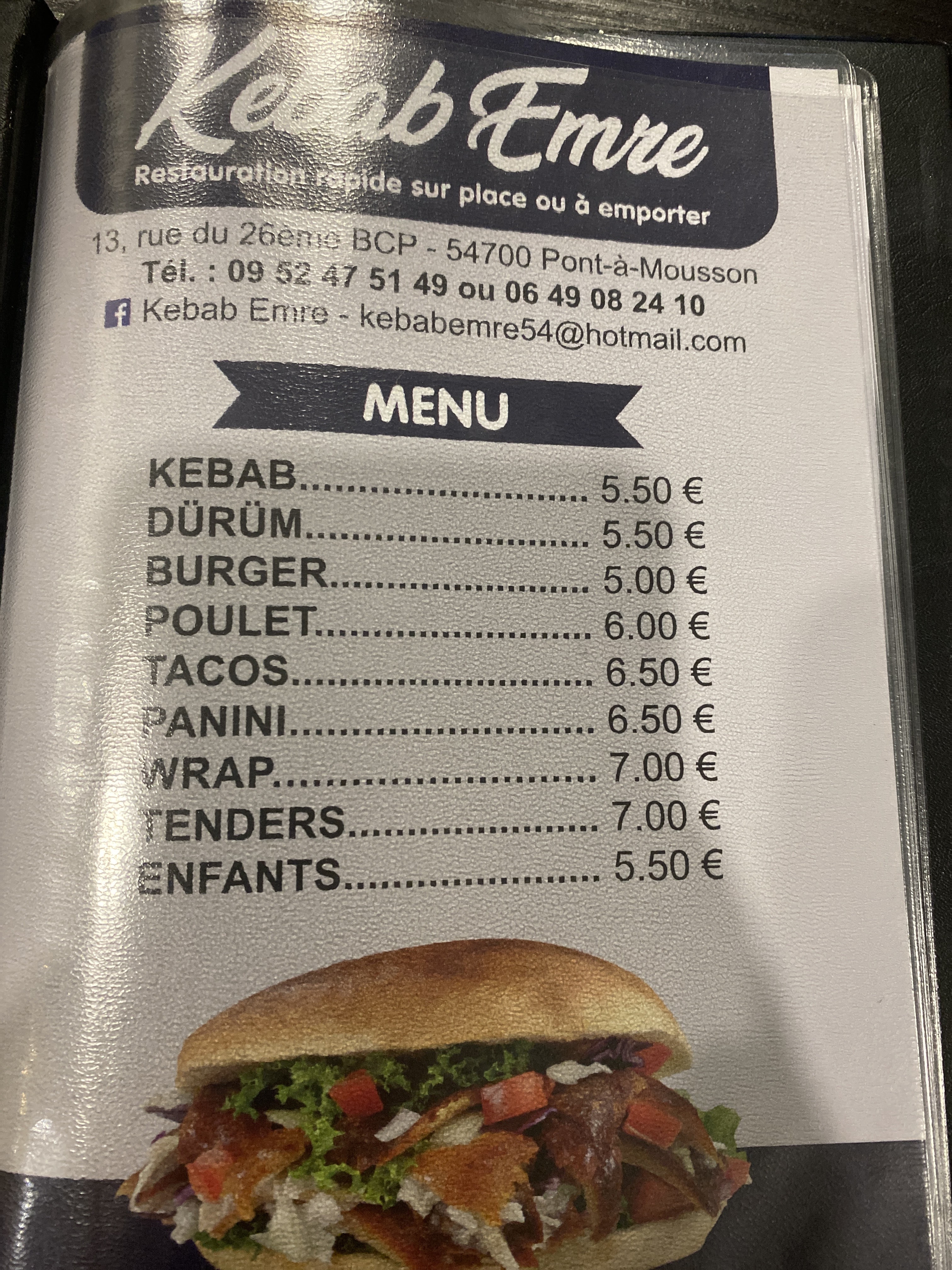 La dame est son marie sont des gens plutôt souriant et agréable . Cependant quand on fait une demande spécifique (genre mettre des frites dans un lahmacun) la dame refuse, je crois qu’elle a oublier que le client était roi à partir du moment où il payent.. Le Menu a emporté est ridicule.. aucune précisions sur les produits, aucunes photos des produits... on ne comprends plus rien entre Wrap, tacos, et durum... qui est quoi ?? De plus, elle prétend faire des panini, mais y’a pas d’infos autre que « panini »! Je conseil cette dame de refaire une carte qui donne envie, même moi en tant que particulier je peux mieux faire . Les prix sont correct, les portions généreuses, la viande à kebab quant à elle laisse à désirer , mais reste passable, une viande bien cuite est préférable ! (En général je regarde la broche, si la viande n’est pas bien bien dorée j’achète pas) et c’est souvent le cas chez Emre kebab . Parcontre le steak haché pour américain a plutôt bon goût. Quand les défauts cités ci dessus seront plus d’actualités je reviendrai avec plaisir mettre 5* !