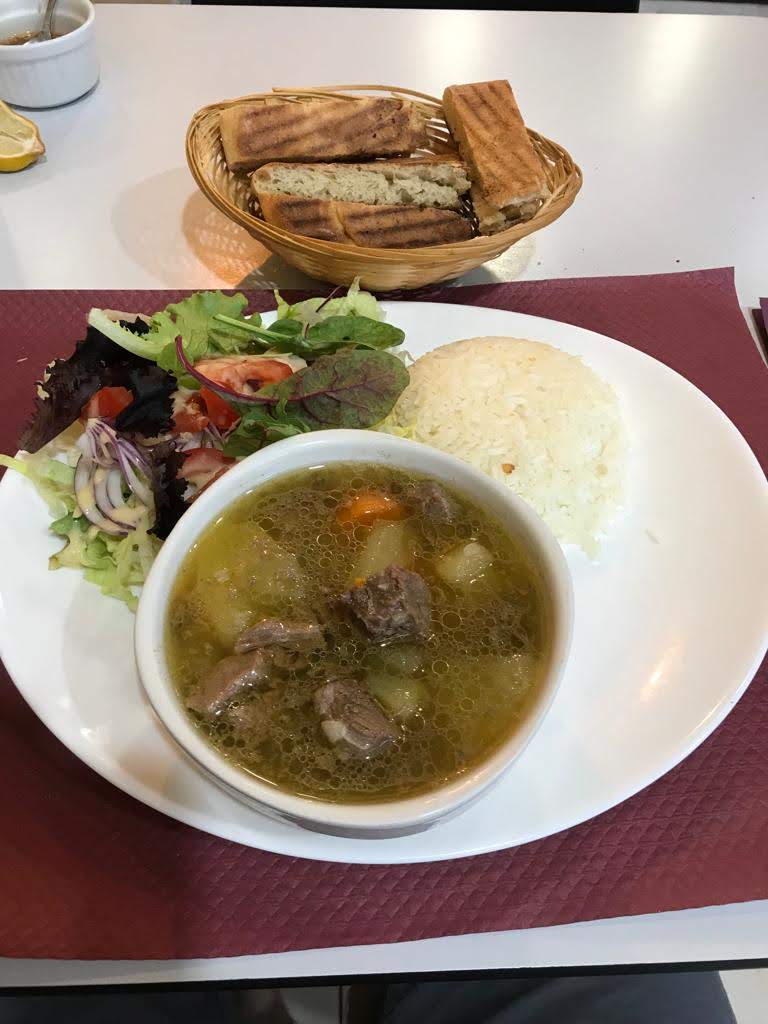 N’oubliez pas de demander le menu du jour ! Ici une très bonne soupe de lentille corail à la turque, et une magnifique assiettes variée riz, viande de veau sauté en sauce.. super propre et très bon !!