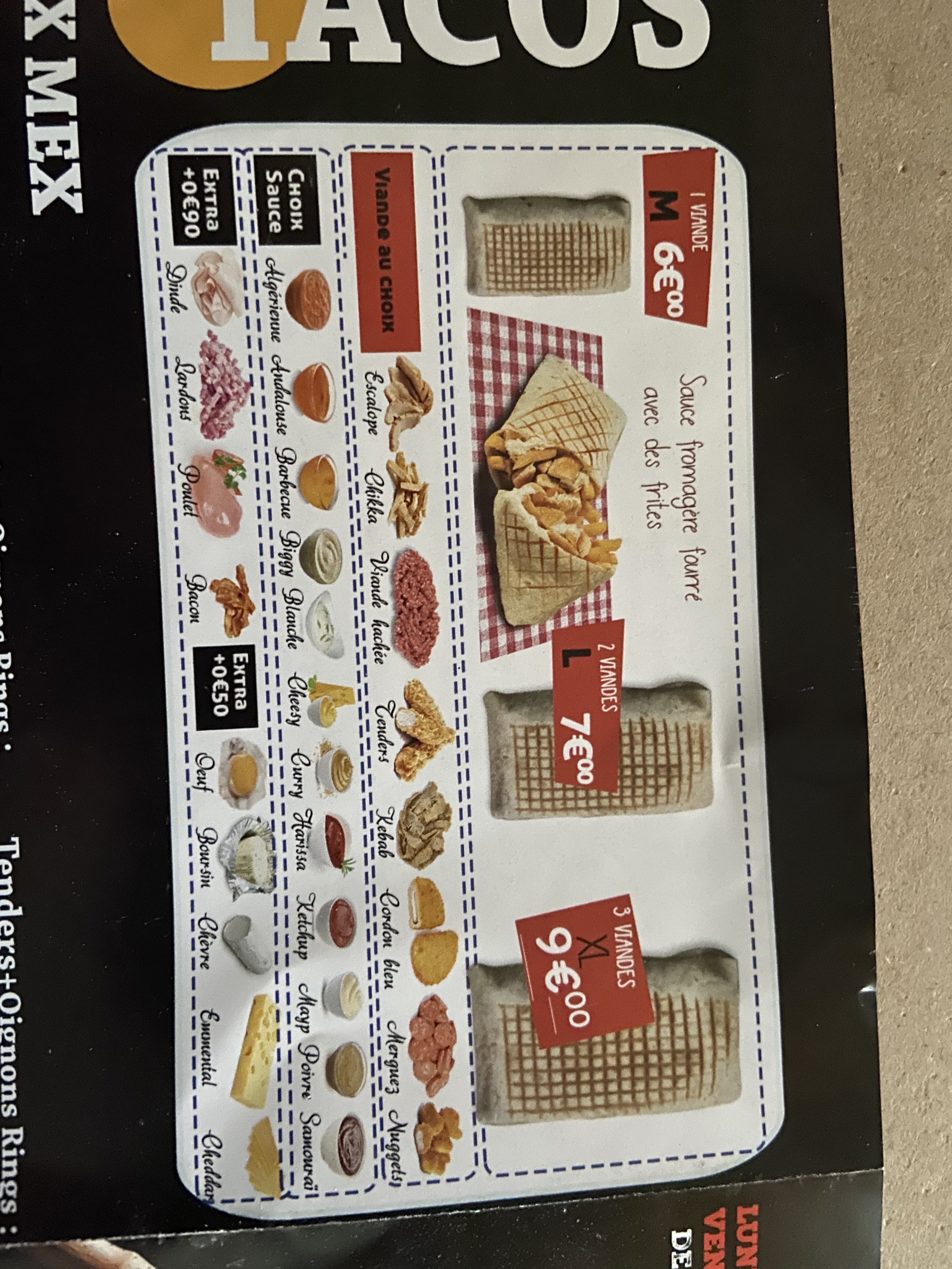 Nous avons commandé deux fois deux tacos donc quatre en tout car on a voulu leurs donner une deuxième chance mais malheureusement les deux fois où nous avons commandé la galette du tacos était cramé c'est vraiment dommage car le reste a l'air bon je ne recommande pas car deux jours différents et la même chose.