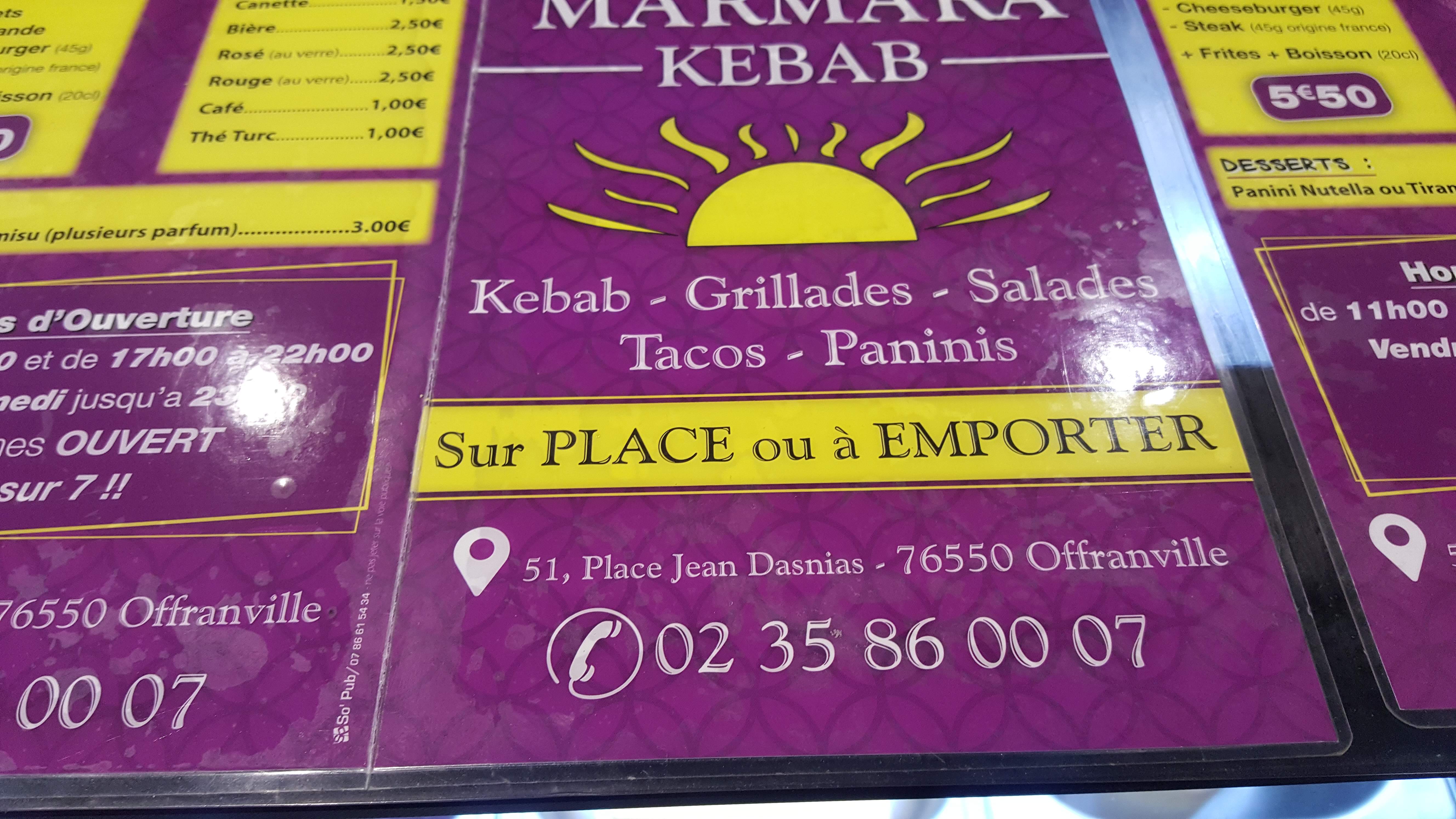 Voici toutes les informations sur le Kebab Marmara Kebab qui ce trouve au 51 place jean dasnias, 76550 Offranville (76). Sur cette fiche vous trouverez les photos, l'adresse, les horaires d'ouverture, le numero de téléphone et les avis clients.Vous pouvez églement rédiger un avis si vous le souhaitez en bas de page.