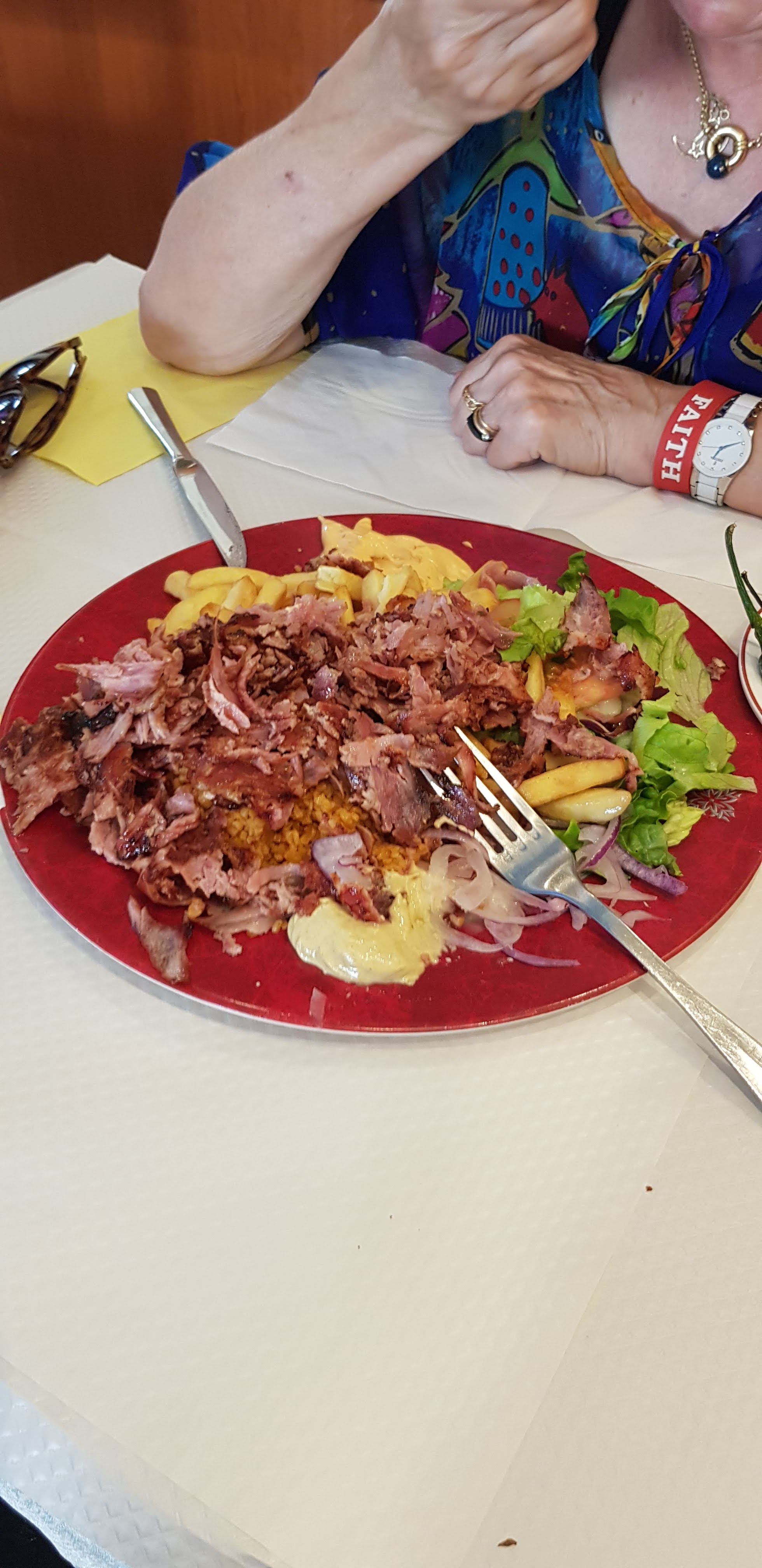 Une découverte à Melun un restaurant servant de la viande au couteau : un kebab pour être plus précis tenu exclusivement par deux femmes très sympathiques. La carte était limitée à un seul choix : kebab avec frites, blé salade, tomate, oignon, sauce blanche faite maison et la harissa. Donc je ne peux pas vous en dire plus. Le kebab était un peu sec: une viande trop cuite à mon goût. Et le tout servi dans une assiette garnie sans excès. Je recommande pour découvrir un kebab tenu par des femmes et pour les frites savoureuses.