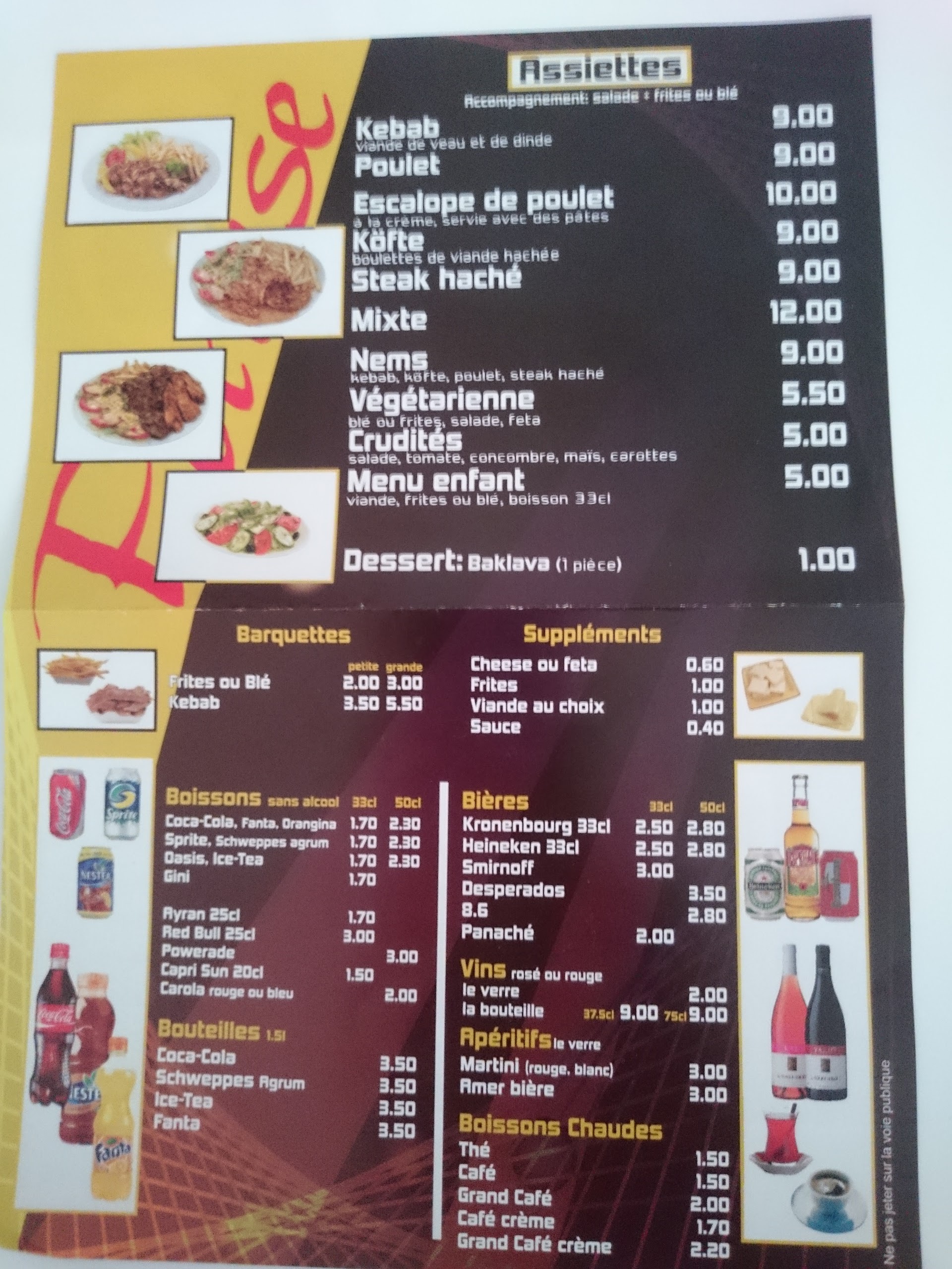 Prix exorbitants. Le kebab n’est pas bon du tout, la viande pas cuite et le pain très dur. Pas de mouchoirs et même la sauce est payante du jamais vu. Ambiance gênante…. Je ne recommande pas !