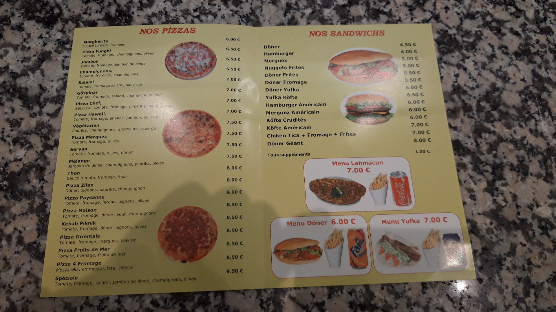 Très bon accueil Bonne assiette , bon yufka ! Pain fait maison ! Et la sauce yaourt maison est top ! Les pizzas sont top mieux que les restos ou les concurrents car plus chargé a prix raisonnable !